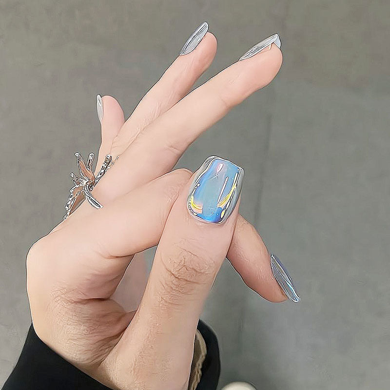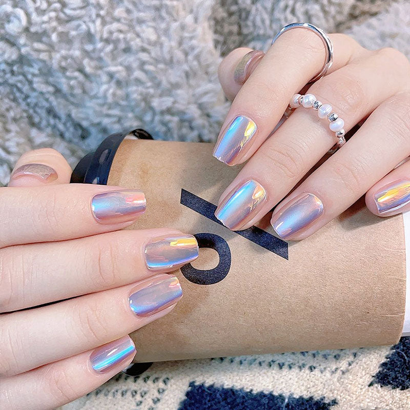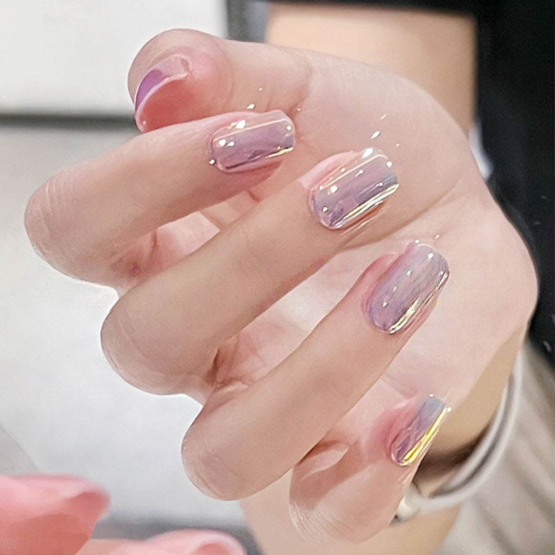 These handmade short circular nails feature a purple shimmering finish with trendy 3D accents, offering a stylish and cute look. Designed as detachable, white-toned nail strips, they provide a high-end wearable experience that’s easy to apply and remove. Perfect for quick nail art, these nails suit daily wear while adding a subtle yet fashionable touch to your style.
